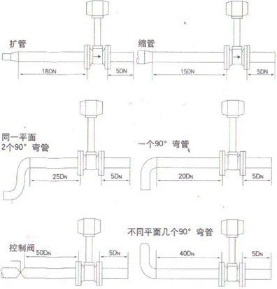 安裝條件:渦街流量計(jì)應(yīng)遠(yuǎn)離振動源,有振動時在前后直管段2DN處加支架用橡皮減振。傳感器通徑圓應(yīng)與直管段內(nèi)徑圓保持同心。法蘭焊接時,密封夾緊時,管內(nèi)不得有突出部分。流向應(yīng)與箭頭方向一致。(高溫時推薦2、3、4位置,常溫和低溫時推薦1位置,垂直管道時選3位置)見圖6