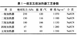 相同類型的差壓變送器,一效至四效加熱器液位變送器測量準(zhǔn)確,而五效加熱器液位變送器液位出現(xiàn)異常波動,一效至五效加熱器工藝參數(shù)如表1所示。從液位變送器測量原理可以得出,與液位測量有關(guān)的工藝參數(shù)有壓力、溫度、密度及被測介質(zhì)等。