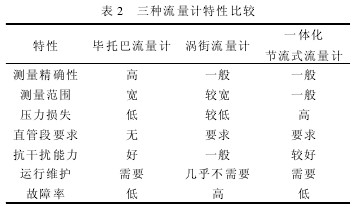 根據(jù)三種流量計(jì)的特點(diǎn),從測(cè)量精確度、測(cè)量范圍、壓力損失、抗干擾能力及運(yùn)行維護(hù)等方面進(jìn)行比較,如表2所示。