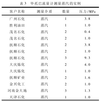 由于被測(cè)介質(zhì)管徑較大(DN700),工作流量范圍寬(10~150t/h),渦街流量計(jì)和一體化節(jié)流式流量計(jì)在低流量時(shí)保證測(cè)量的準(zhǔn)確性方面差一些,會(huì)造成一定的測(cè)量誤差,而畢托巴流量計(jì)測(cè)量范圍較寬,既能夠保證小流量時(shí)準(zhǔn)確測(cè)量,又能滿足大流量的準(zhǔn)確測(cè)量,同時(shí)在大管徑上的安裝也較易實(shí)現(xiàn)。參照其他企業(yè)畢托巴流量計(jì)測(cè)量低壓蒸汽的成功經(jīng)驗(yàn),如表3所示,確定該低壓蒸汽計(jì)量采用的流量計(jì)為畢托巴蒸汽流量計(jì)。
