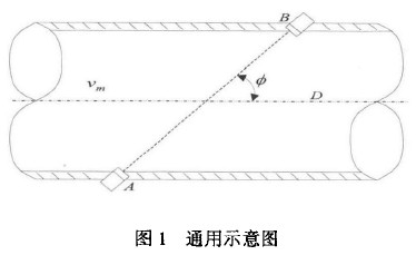 標(biāo)準(zhǔn)表法在線校準(zhǔn)是在大口徑電磁徑流量計(jì)所在管道上串聯(lián)一個(gè)精度較高的外夾式超聲流量計(jì)作為標(biāo)準(zhǔn)表,對(duì)在線的電磁流量計(jì)和前后連接管道、介質(zhì)流動(dòng)狀態(tài)等組成的流量測(cè)量系統(tǒng)的整體校準(zhǔn)。使流體在相同的時(shí)間間隔內(nèi)連續(xù)通過(guò)標(biāo)準(zhǔn)表和被校流量計(jì),記錄被檢表和標(biāo)準(zhǔn)表的流量值,以標(biāo)準(zhǔn)表示值作為標(biāo)準(zhǔn)值,計(jì)算被檢流量計(jì)的誤差。標(biāo)準(zhǔn)表超聲流量計(jì)測(cè)量流量是以測(cè)量聲波在流動(dòng)介質(zhì)中傳播的時(shí)間與流量的關(guān)系為原理。通常認(rèn)為聲波在流體中的實(shí)際傳播速度是由介質(zhì)靜止?fàn)顟B(tài)下聲波的傳播速度(C/)和流體軸向平均流速(νm) 在聲波傳播方向上的分量組成。按圖1所示,順流和逆流傳播時(shí)間與各量之間的關(guān)系是:
