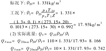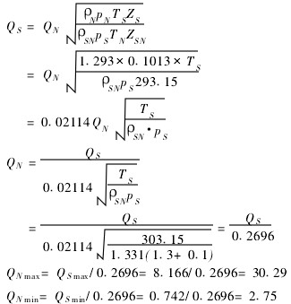 式中:ZS(ZSN)為被測(cè)氣體在標(biāo)準(zhǔn)狀態(tài)(工作狀態(tài))下壓縮系數(shù)(一般情況ZSUZSN);QS為工況下氧氣的實(shí)際流量;QN為標(biāo)況下空氣的實(shí)際流量;QN為標(biāo)況下空氣的密度(11293kg/m3);pN為標(biāo)準(zhǔn)大氣壓;TN為標(biāo)準(zhǔn)溫度293115K;QSN為標(biāo)況下氧氣的密度(即Q20);pS為氧氣實(shí)際工作壓力(即p1);TS為氧氣實(shí)際工作溫度(即T1)。