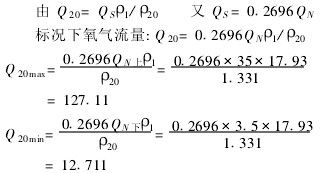 其流量上限FH應(yīng)為金屬轉(zhuǎn)子流量計(jì)刻度上限所對(duì)應(yīng)的標(biāo)準(zhǔn)狀態(tài)下的氧氣流量,因?yàn)榻饘俎D(zhuǎn)子流量計(jì)的刻度為標(biāo)準(zhǔn)狀態(tài)下空氣標(biāo)注,所以必須將其轉(zhuǎn)換為標(biāo)準(zhǔn)狀態(tài)下氧氣流量。