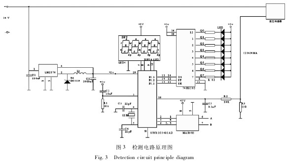 硬件部分的核心為STC12C5412AD,工作電壓由LM2576從24V轉(zhuǎn)變?yōu)?V來提供。同時(shí),用MCU的3個(gè)輸出引腳P1.1、P1.2、P1.3連接串并轉(zhuǎn)換芯片74HC595,就可實(shí)現(xiàn)對系統(tǒng)所有的顯示功能及顯示元件的控制。圖3中的74HC595芯片Q0~Q7共8位輸出控制8個(gè)發(fā)光二極管,每個(gè)二極管分為閃、亮2段,共16段,通過燈的閃亮和4個(gè)數(shù)碼管顯示的罐內(nèi)液體容積值來記錄相關(guān)液位數(shù)據(jù)。其檢測電路原理圖如圖3所示。