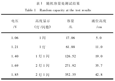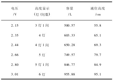 首先將液位計(jì)正確安裝于儲液罐底部,接通電源后利用串有流量計(jì)的電泵開始注水,注意觀察液位的變化,待快到預(yù)先暫定的水容量處關(guān)閉電源。此時(shí),用萬用表讀取液位計(jì)處理后的電壓值、記錄表示高度顯示的LED的燈/閃數(shù)及流量計(jì)顯示的實(shí)際注水容量,再用米尺丈量水的實(shí)際液位高度。試驗(yàn)結(jié)果如表1所示。