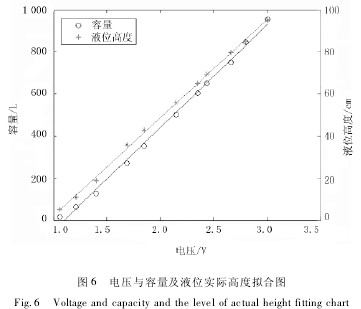 由此可見:電壓與容量及液位高度之間確實(shí)存在良好的線性相關(guān)性,且從表1中也可以看出LED燈的亮、閃數(shù)隨液位高度而變化! ∫虼,一旦配比好定量的液肥,在變量施肥機(jī)工作時(shí),可以根據(jù)LED燈來判斷其液位高度,用數(shù)碼管來顯示其容量。