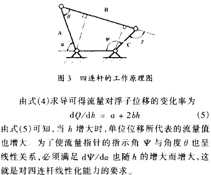 目前,國(guó)內(nèi)外金屬管轉(zhuǎn)子流量計(jì)采用的線性化技術(shù)主要有兩種:一是應(yīng)用四連桿進(jìn)行非線性修正;二是利用凸輪進(jìn)行非線性修正。下面著重介紹這兩種線性化技術(shù)。