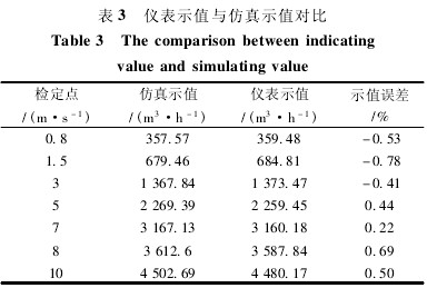 為了驗證通過上述方法所得到的插入式電磁流量計等效信號作用范圍的可靠性,把該尺寸的傳感器探頭形狀加工制作成流量計樣機在口徑為 400mm 的管道上進行流量測量,插入深度也保持在 120mm。其測量得到的體積流量與仿真得到的流量進行對比,如表 3 所示,其中計算仿真流量示值所用的流速是上述得到的等效信號作用范圍內(nèi)的平均流速ū。
