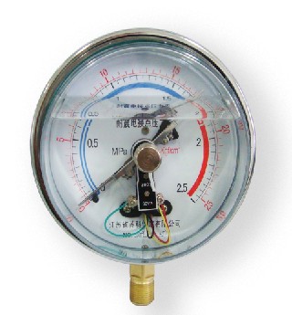 在電接點壓力表裝置的電接觸信號針上,裝有可調(diào)節(jié)的永久磁鋼,可以增加接點吸力,加快接觸動作,從而使觸點接觸可靠,消除電弧,能有效的避免儀表由于工作環(huán)境振動或介質(zhì)壓力脈動造成觸點的頻繁關(guān)斷。所以電接點壓力表具有動作可靠、使用壽命長、觸點開關(guān)功率較大等優(yōu)點。